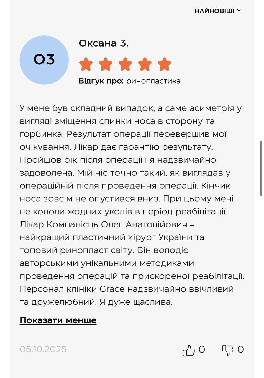 Досвід та професіоналізм — запорука успішної ринопластики.”